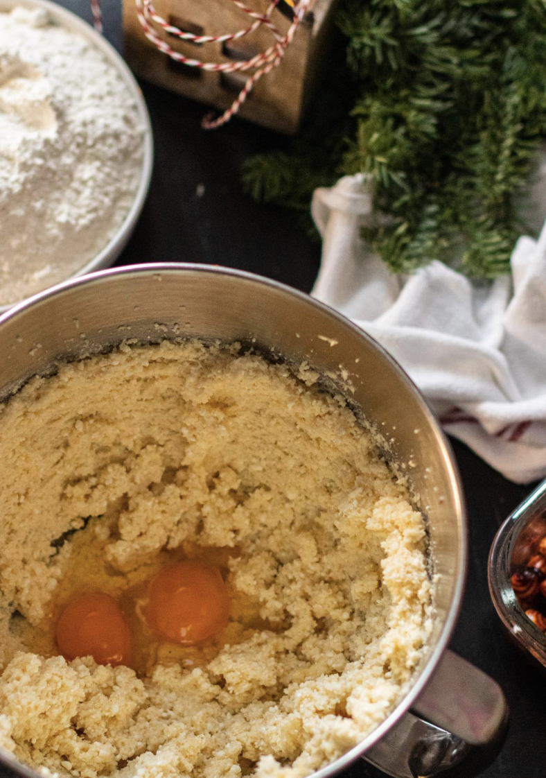 - Муку смешать с разрыхлителем и порциями добавить в яично-масленную смесь вместе со специями.