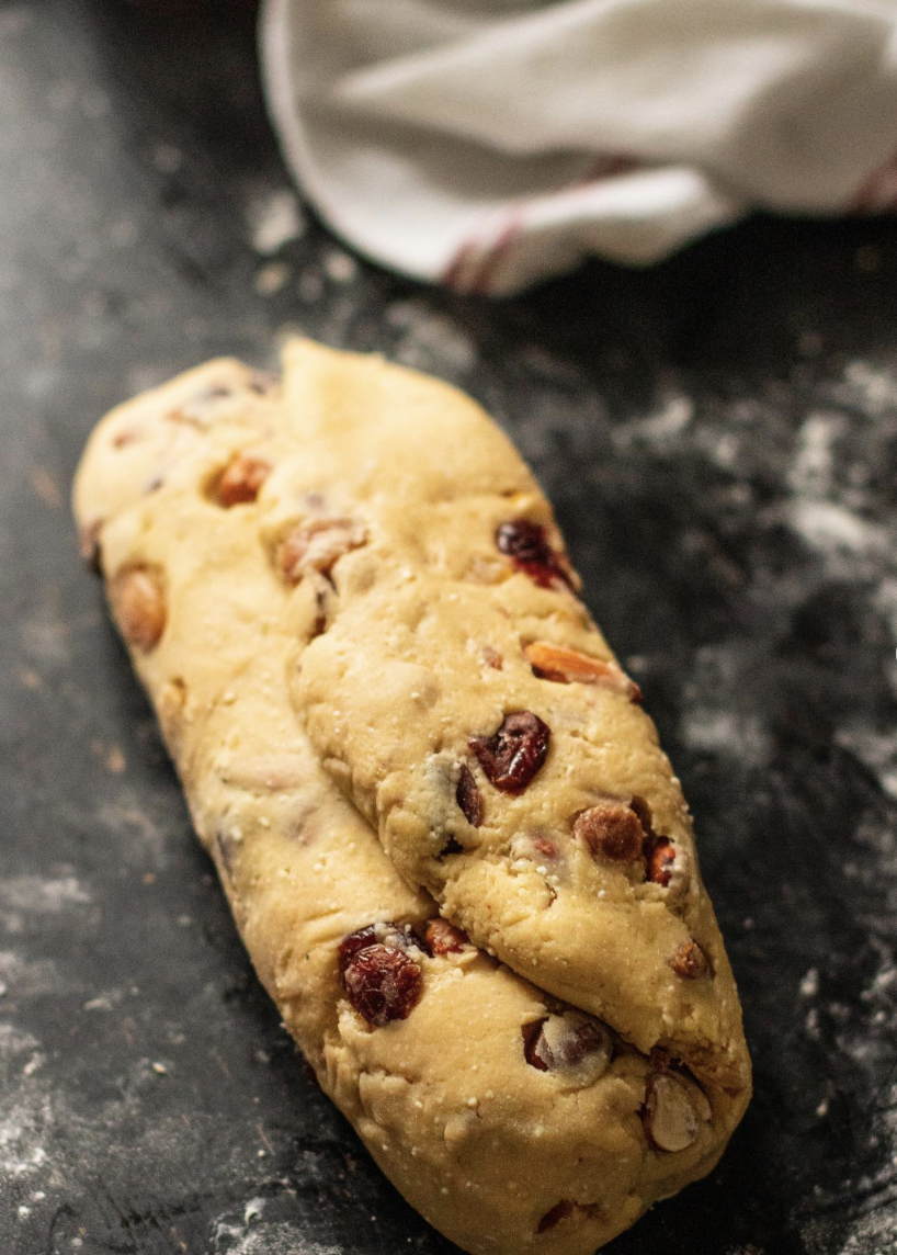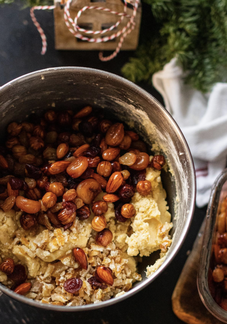 3. Теперь очередь сухофруктов: добавляем в тесто и перемешиваем (в рецепте еще есть марципан, но если его нет и найти не вариант, штоллен хорош и без него).